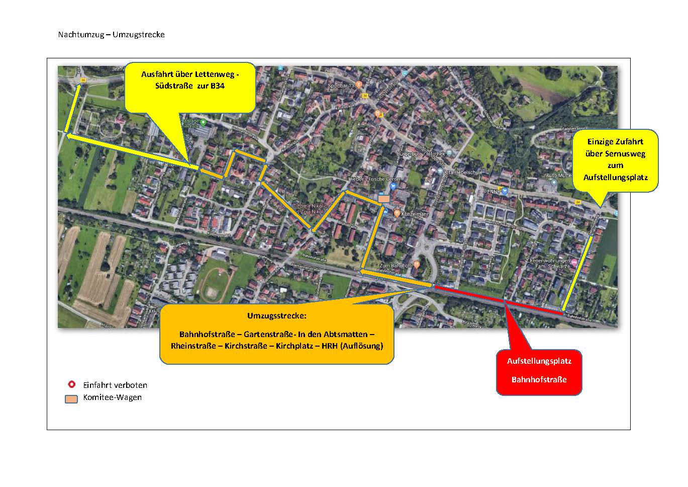 In Wyhlen stellen sich am Fasnachtssonntag und beim Nachtumzug die Narren und Fasnachtswagen in der Bahnhofsstraße ab dem Bahnhof bis zum Sernussweg auf und ziehen über Bahnhofsstraße, Gartenstraße, In den Abstmatten, Rheinstraße, Kirchstraße, Kirchplatz und Lettenweg bis zum Parkplatz der Hochrheinhalle.